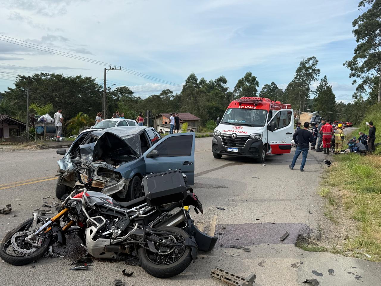 Uma colisão envolvendo um automóvel e uma motocicleta de alta cilindrada resultou na morte de uma mulher de aproximadamente 30 anos na tarde desta terça-feira