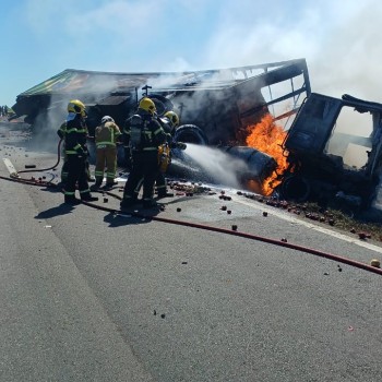Um incêndio de grandes proporções atingiu uma carreta que transportava carga de cebola nesta quarta-feira (17), na BR-101, na localidade de Morro Azul, em Jaguaruna,