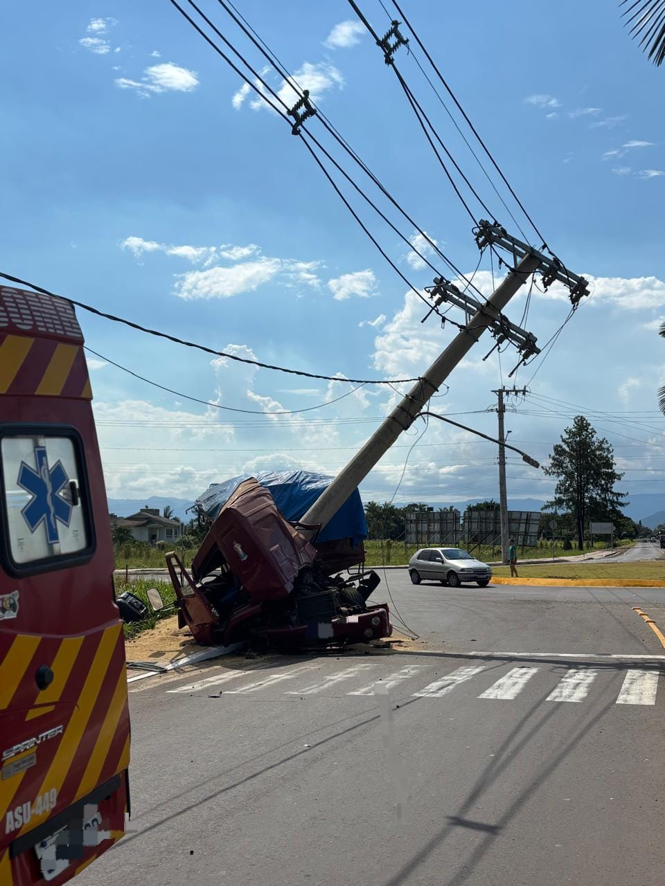 Um acidente de trânsito envolvendo um caminhão carregado de arroz e um poste de energia elétrica foi registrado na tarde desta terça-feira (10), por volta