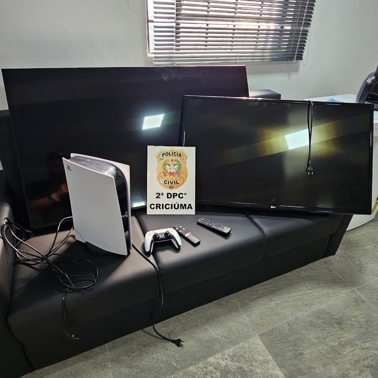 Após o cumprimento dos mandados, os Policiais Civis recuperaram dois televisores, sendo um de 55” e outro de 43”, além de um console Sony Playstation 5, subtraídos da casa da vítima durante o furto. Os bens estão avaliados em aproximadamente R$ 6.500,00.