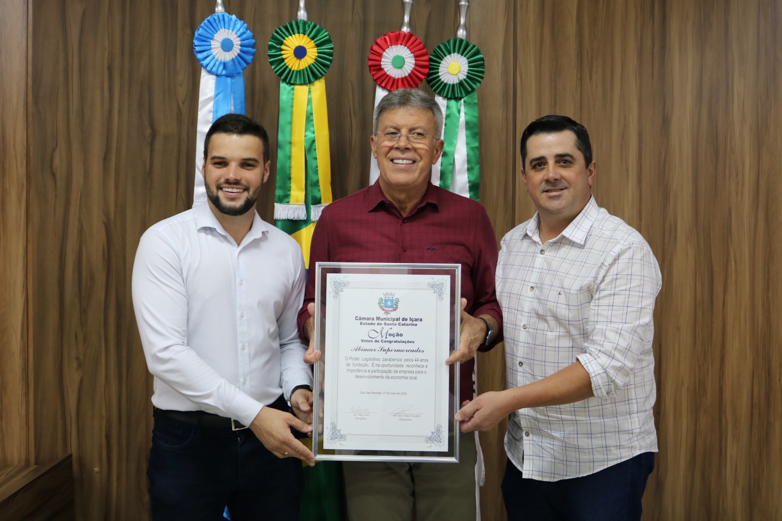 O Abimar Supermercados recebeu da Câmara Municipal de Içara moção com votos de congratulações pelos 44 anos de fundação nesta segunda-feira (06). A homenagem proposta pelo vereador Davi Inácio Nazário (PL), foi entregue para o empresário Custódio Abílio da Silva, o Neném.