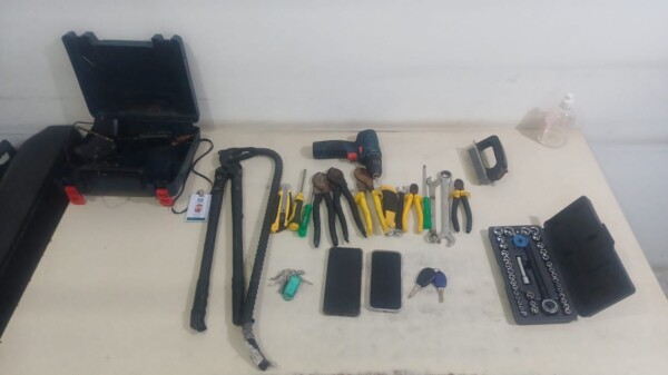 No interior do veículo estavam dois homens. Durante a busca veicular, os policiais encontraram uma grande quantidade de fios de cobre, totalizando cerca de 430 quilos, além de diversas ferramentas utilizadas na prática do crime, como alicates de corte, parafusadeira, baterias, carregador, jogo de soquetes, pé de cabra e chaves diversas. Também foi localizado um molho de chaves que dava acesso às bases da empresa, utilizado para facilitar a entrada nos imóveis.