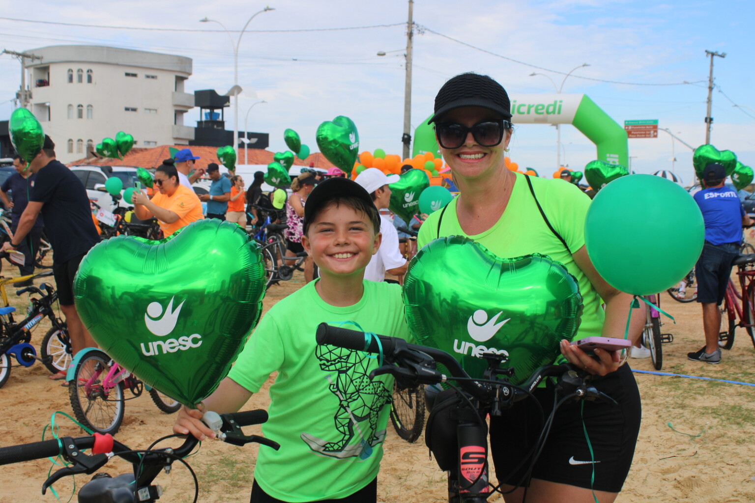 Os balões verdes com a marca da Unesc embelezaram ainda mais o cenário da tarde deste sábado no 17º Passeio Ciclístico da Integração, realizado no Balneário Rincão. A saída do passeio foi realizada na Praça Central do Balneário, onde foram distribuídos mais de 200 balões com gás hélio como adorno para as bicicletas dos participantes.