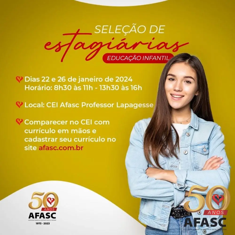 A Associação Feminina de Assistência Social de Criciúma (Afasc) informa uma nova oportunidade para estudantes interessadas em integrar a equipe dos Centros de Educação Infantil (CEIs).