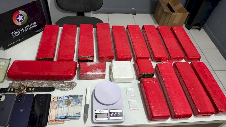 No interior do veículo, os policiais encontraram aproximadamente 15 quilos de maconha, 500 gramas de cocaína, uma balança de precisão e um aparelho celular.