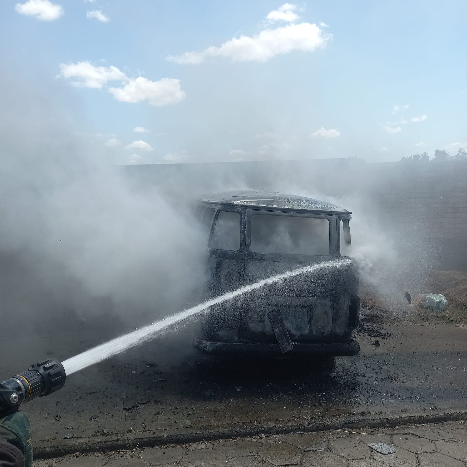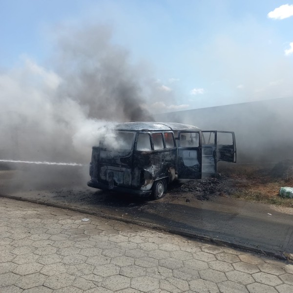 No local foi confirmada a natureza da ocorrência, tratava-se de um carro da marca VW/Kombi 1997 cor branca, no acostamento, completamente tomado pelas chamas.
