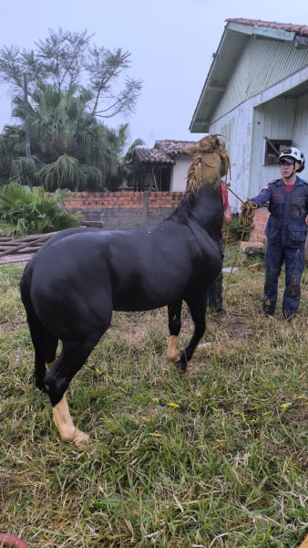 Um cavalo de 13 anos foi resgatado pelo Corpo de Bombeiros no início da tarde desta segunda-feira (18), após cair em um poço com aproximadamente sete metros de profundidade, na Rua Antonio Ivanor Dela Bruna, bairro Linha Batista, em Criciúma.