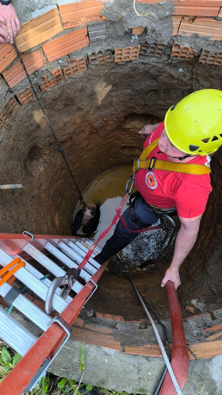 Durante a operação, os bombeiros também precisaram utilizar uma bomba submersível elétrica para retirar a água do poço, reduzindo o risco e facilitando a fixação das fitas. A ação foi dificultada pelo porte do animal e pela agitação durante as tentativas de aproximação.