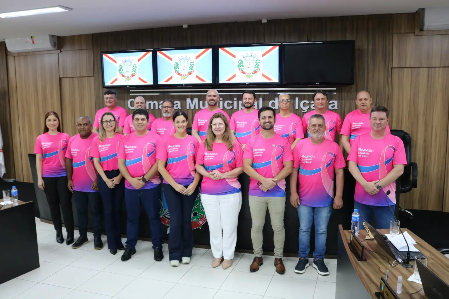 O Legislativo içarense na sessão ordinária desta segunda-feira (06), se vestiu de rosa para lembrar a sociedade da importância da prevenção e o diagnóstico precoce do câncer de mama, destacando a campanha do Outubro Rosa. As camisetas produzidas pela Rede Feminina de Combate ao Câncer de Içara, foram adquiridas por cada um dos vereadores e servidores da Casa. “Fica livre para as próximas sessões no mês de outubro os vereadores usarem no Plenário essa camiseta alusiva ao Outubro Rosa”, comentou o presidente da Câmara Municipal, Duca Zata (PP).
