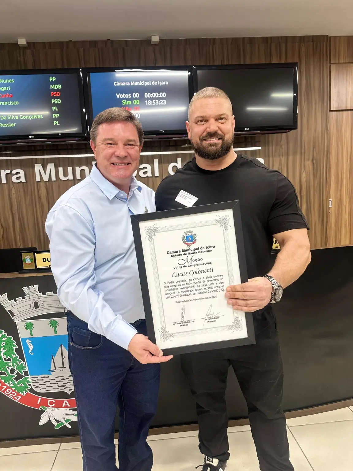 O atleta içarense Lucas Colonetti, recebeu moção do Poder Legislativo parabenizando pelo título de campeão mundial de powerlifting, modalidade levantamento de peso terra e vice campeão na modalidade supino. A competição ocorreu entre os dias 22 e 26 de outubro, em Balneário Camboriú (SC). Para o proponente da moção vereador Sandro Ressler (PL), as conquistas projetam o nome de Içara no cenário esportivo nacional e internacional, servindo de exemplo e inspiração para jovens atletas e para toda a comunidade.