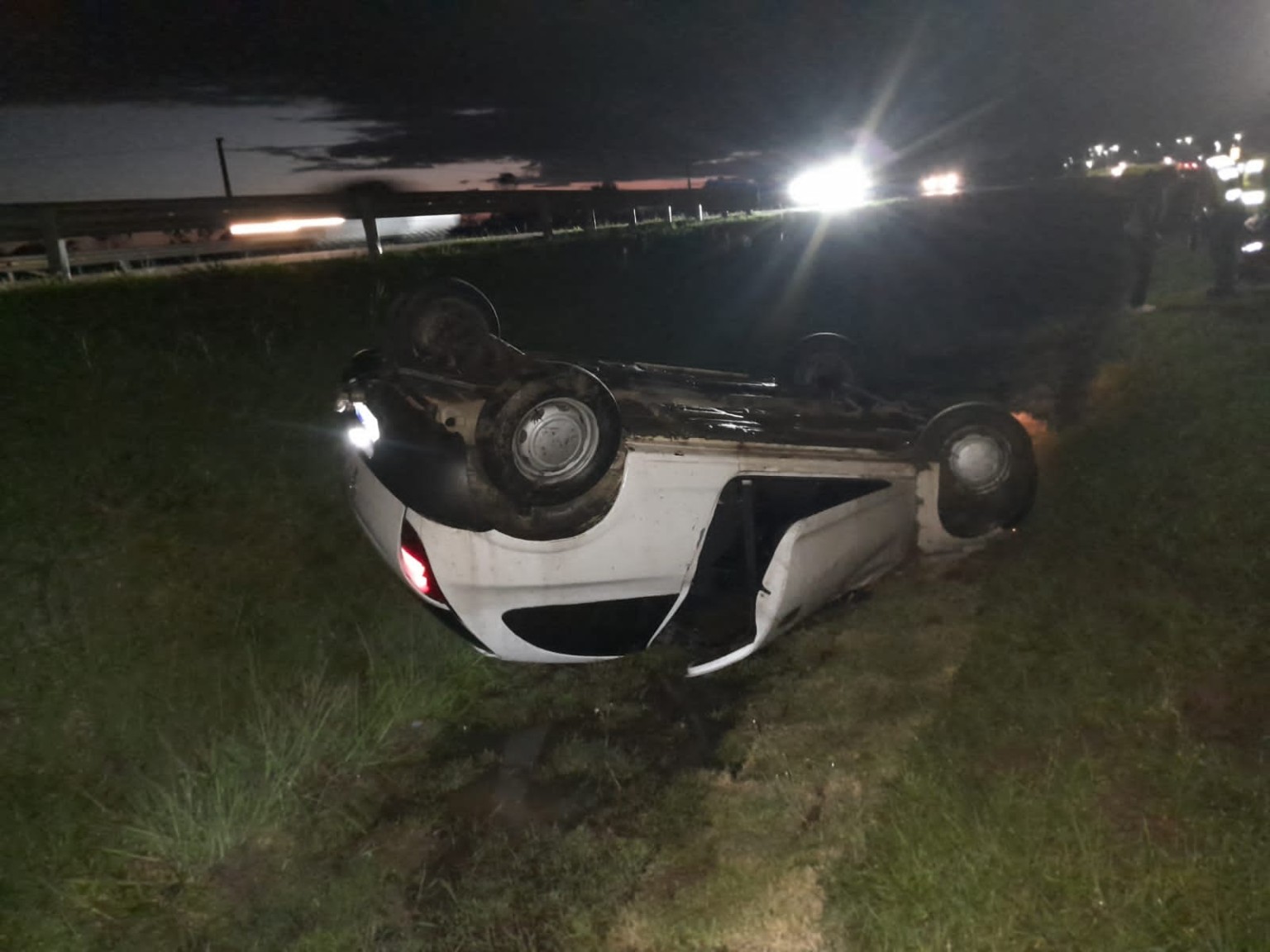De acordo com o Corpo de Bombeiros Militar, a guarnição do ASU-557 encontrou o motorista consciente, orientado e caminhando fora do veículo, um Celta branco, que estava capotado no vão central da rodovia.