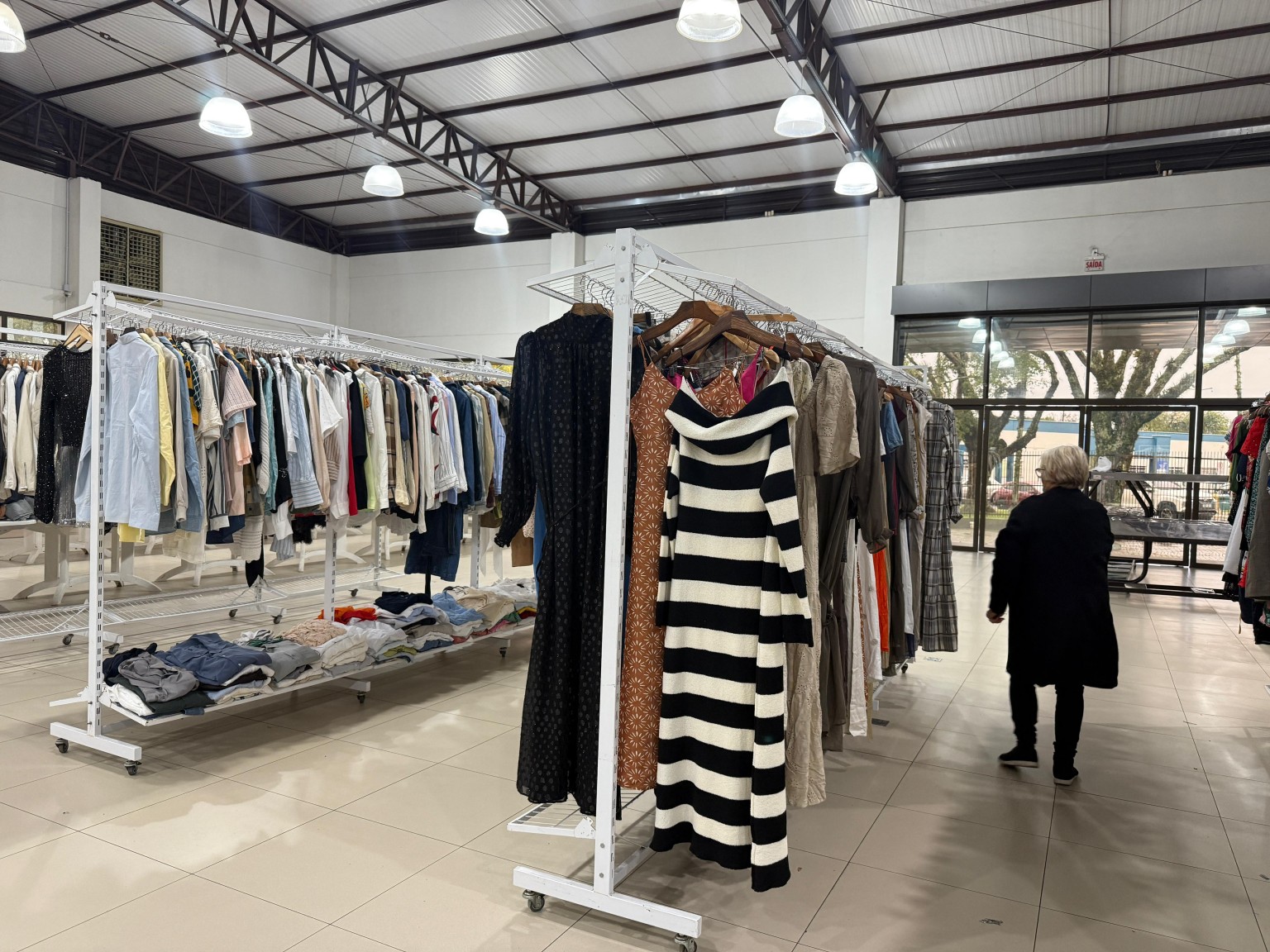 Entre os itens disponíveis estão roupas novas femininas, masculinas, infantis, além de sapatos e acessórios.
