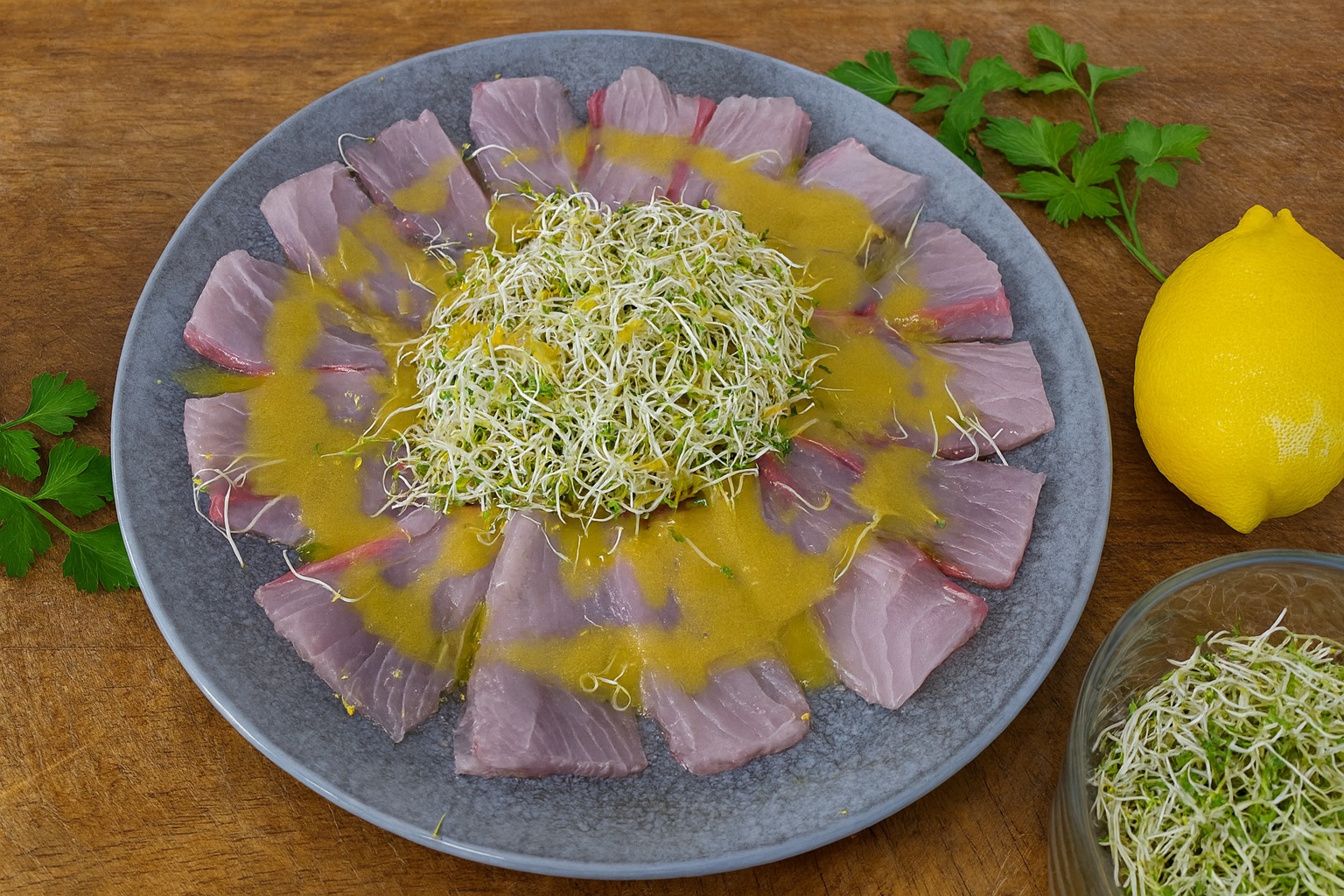 O carpaccio consiste em um ingrediente cru cortado bem fino e temperado com criatividade. O olhete é ideal: um peixe branco de sabor leve e carne firme.