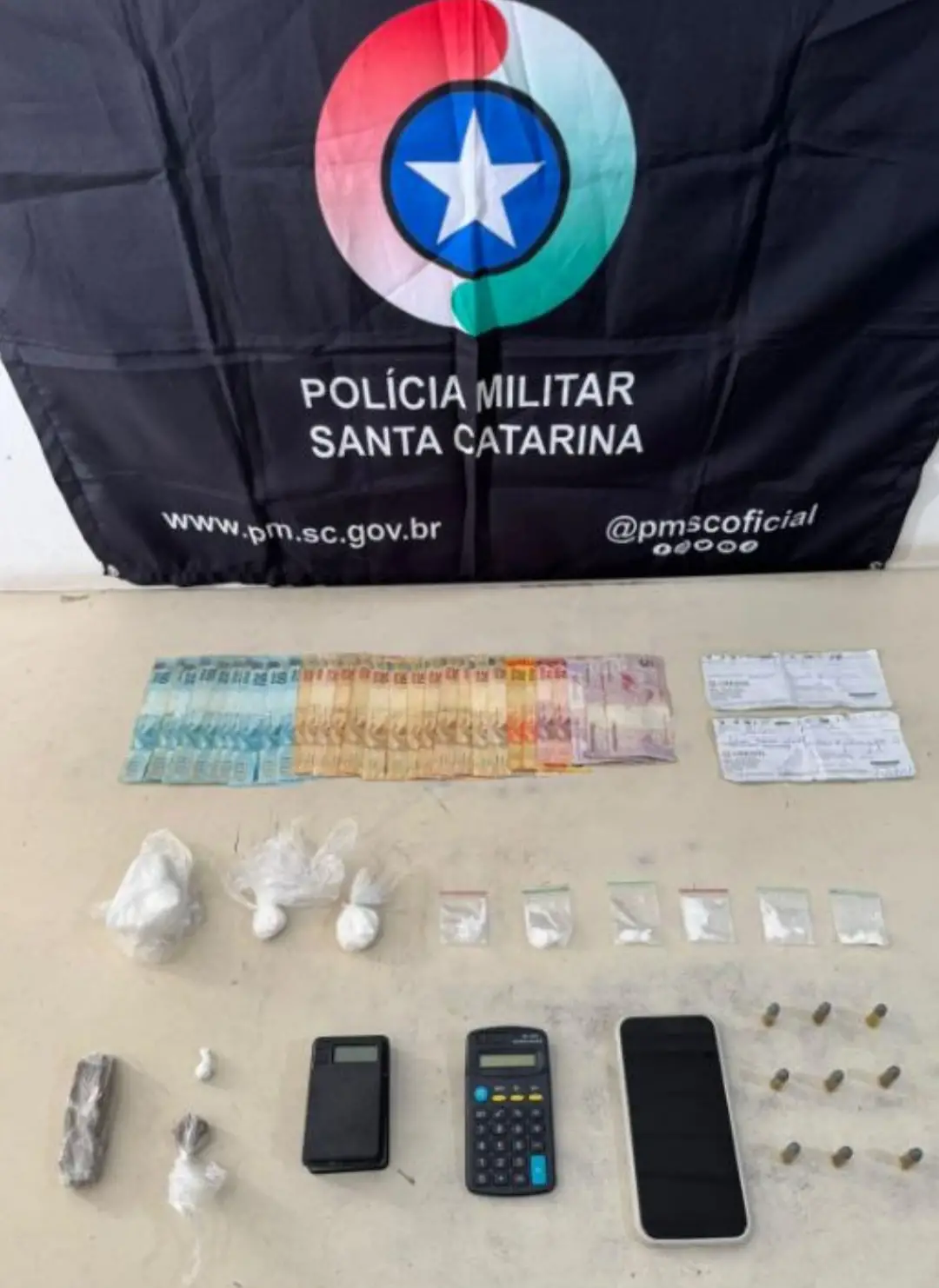 A Polícia Militar prendeu um homem por tráfico de drogas e posse de munições de uso restrito durante uma abordagem no bairro Januária, em Sombrio.