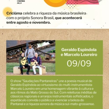 O projeto nacional Sonora Brasil Sesc – Região Centro-Oeste traz a Criciúma o espetáculo “Saudações Pantaneiras”, no dia 9 de setembro (terça-feira), às 19h30, no
