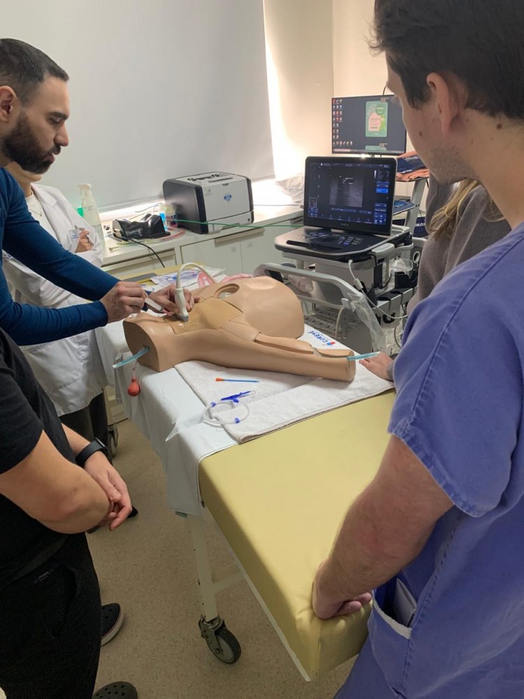 O conteúdo programático das sessões práticas abrange técnicas essenciais, incluindo ultrassonografia para acesso venoso profundo, avaliação pulmonar, abdominal e cardíaca em situações críticas, bem como a execução de protocolos consagrados, a exemplo do FAST (Focused Assessment with Sonography for Trauma).