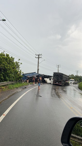 Após o atendimento, a Polícia Rodoviária Estadual informou que a SC-443 permaneceria totalmente interditada até a retirada das carretas, com posterior acionamento para limpeza da pista.