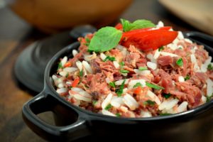 MODO DE PREPARO – Deixe a carne seca de molho de véspera, troque a água e cozinhe até ficar macia. Desfie. Frite-a em uma panela com azeite. Quando a carne estiver dourada, coloque a cebola e o alho. Junte o arroz e frite. Acrescente a água fervente e cozinhe em fogo baixo até o arroz ficar macio. Salpique o cheiro-verde e sirva em seguida. Bom apetite.