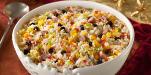 MODO DE PREPARO – Cozinhe o arroz conforme o seu gosto e reserve-o. Em uma panela, leve ao fogo uma medida de manteiga e frite as passas e as ervilhas. Despeje a mistura em uma tigela funda e junte a cebolinha verde, a cenoura, o pimentão, a cebola, a salsa e o parmesão. Adicione o arroz cozido e misture tudo cuidadosamente.