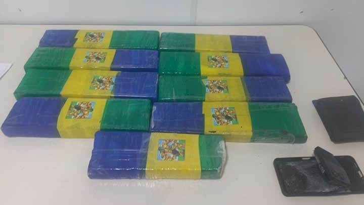 Na busca veicular, foram encontrados nove tijolos de maconha no assoalho do veículo, que pesaram aproximadamente oito quilos da droga.