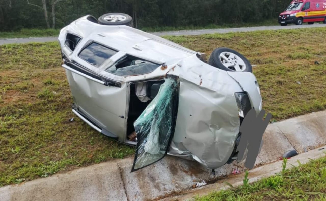 Na manhã desta quinta-feira (25), por volta das 7h30, um carro capotou no canteiro central da Rodovia Aristides Bolan (Via Rápida), no bairro Primeira Linha, em Criciúma.