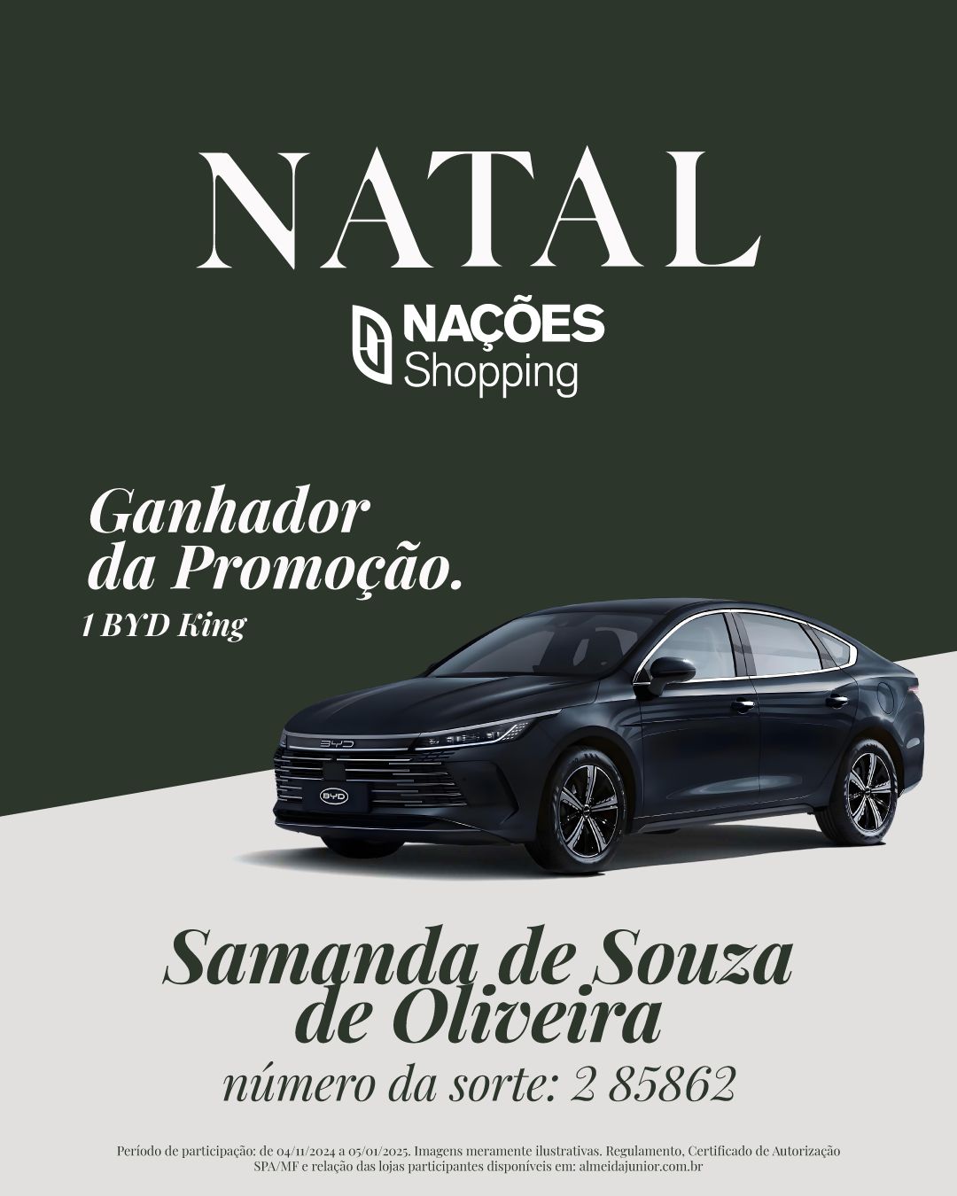 O Natal de 2024 foi ainda mais especial para os clientes dos shoppings do grupo Almeida Junior, com uma campanha que premiou um cliente de cada unidade com um BYD King Híbrido. A ação ocorreu nos shoppings Continente Shopping, Balneário Shopping, Garten Shopping, Nações Shopping, Neumarkt e Norte Shopping, reunindo milhares de participantes em busca do grande prêmio. No Nações Shopping, o sorteio foi realizado na última semana, e premiou Samanda de Souza de Oliveira, com o Número da Sorte 2 85862.