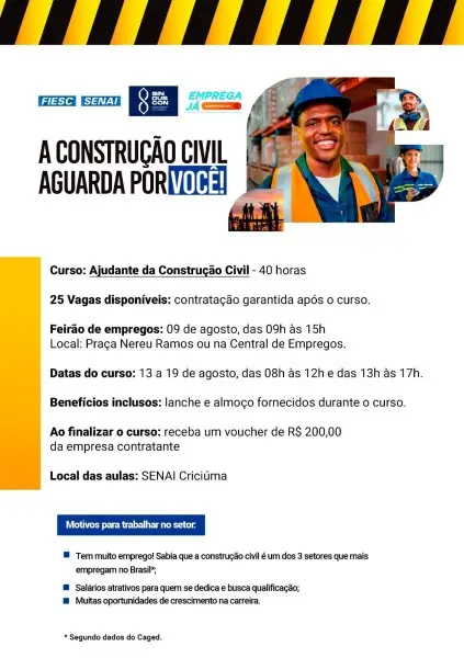 O Sindicato da Construção Civil de Criciúma (Sinduscon), em parceria com o SENAI está oferecendo uma oportunidade gratuita de qualificação profissional. Por meio do Feirão do Emprego Emprega Já – Construção Civil, o sindicato oferecerá uma oportunidade para se capacitar gratuitamente com vaga de emprego garantida na construção civil.