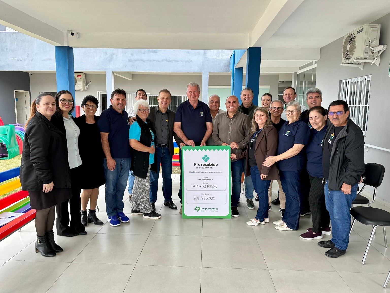 A Cooperaliança realizou nesta semana a entrega de R$ 53 mil em doações a entidades de Balneário Rincão, por meio do Fundo de Assistência Técnica, Educacional e Social (Fates). Na quarta-feira, 01, a Apae do município foi contemplada com R$ 35 mil, destinados ao fortalecimento das atividades de atendimento educacional e terapêutico às pessoas com deficiência intelectual e múltipla. Já nesta quinta-feira, 02, a Paróquia São Francisco de Assis recebeu R$ 18 mil, que serão aplicados em ampliações da estrutura e apoio na realização da festa da comunidade.