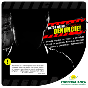 O popular “gato” de energia elétrica é uma prática que traz prejuízos de relevância para toda sociedade e, por isso, a Cooperaliança lançou nessa semana uma campanha para repreender a ação. A concessionária que abrange os municípios de Içara, Balneário Rincão, Jaguaruna e parte de Araranguá atende quase 40 mil consumidores e está intensificando os trabalhos e vistorias diante da prática ilegal de furto e fraude na rede.