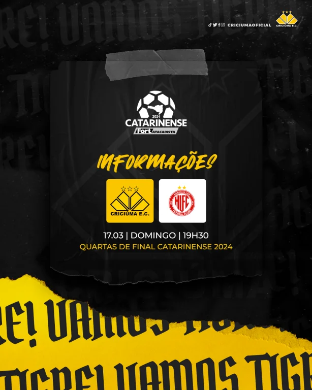 Neste domingo (17/03), o Criciúma enfrenta o Hercílio Luz, pelas quartas de finais do Campeonato Catarinense. O confronto inicia às 19h30, com a abertura dos portões às 17h30h. O valor da inteira é de R$ 200,00 e a meia-entrada no valor de R$ 100,00, sendo a meia, liberada apenas para estudantes, pessoas com deficiência, idosos acima de 60 anos, doadores de sangue, entre outros.