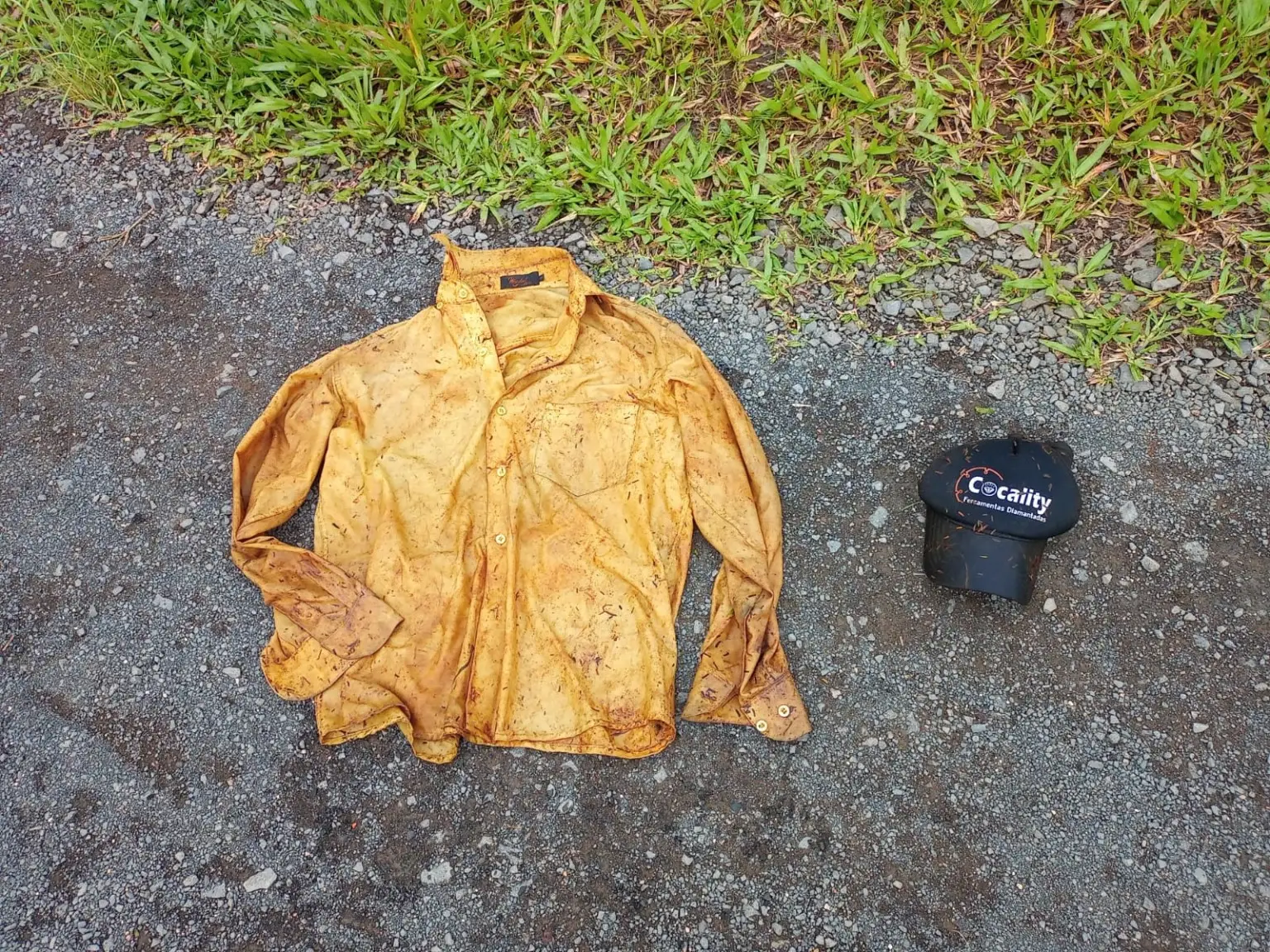 Conforme apurado, foi achado próximo ao cadáver, uma camiseta manga longa, de cor amarela, e um boné preto