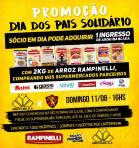 Em homenagem ao Dia dos Pais, celebrado neste domingo, dia 11, o Criciúma lança uma promoção para todos os sócios em dia. Para o jogo contra o Sport, pela 15ª rodada da Série B do Campeonato Brasileiro, neste domingo, às 16h, o torcedor poderá trocar um ingresso de arquibancada por dois quilos de Arroz Rampinelli comprados somente nos supermercados Althoff, Bistek, Giassi, Manenti, Moniari ou MM Rosso. Esses alimentos serão doados para instituições de caridade da região.