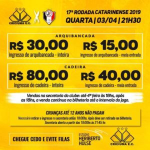 O Criciúma lançou uma promoção de ingressos para que os torcedores carvoeiros possam apoiar a equipe em busca de mais um resultado positivo. A promoção é válida para o jogo desta quarta-feira, dia 3, às 21h30, contra o Joinville, no estádio Heriberto Hülse, pela 17ª rodada do Campeonato Catarinense.