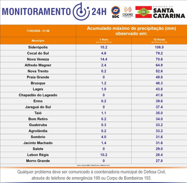 Os dados são provenientes das estações de monitoramento do INMET, Epagri/Ciram, Cemaden e da própria Defesa Civil. O órgão reforça que, em caso de necessidade, a população deve acionar a Defesa Civil pelo 199 ou o Corpo de Bombeiros pelo 193.