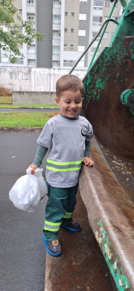 “Arthur é encantado pelo caminhão do lixo. Quando ele ouve o caminhão chegando, fica enlouquecido. Sempre brinca com caminhõezinhos e adora levar o lixo para a lixeira”, conta a mãe do menino, Bruna Smania Vidal.
