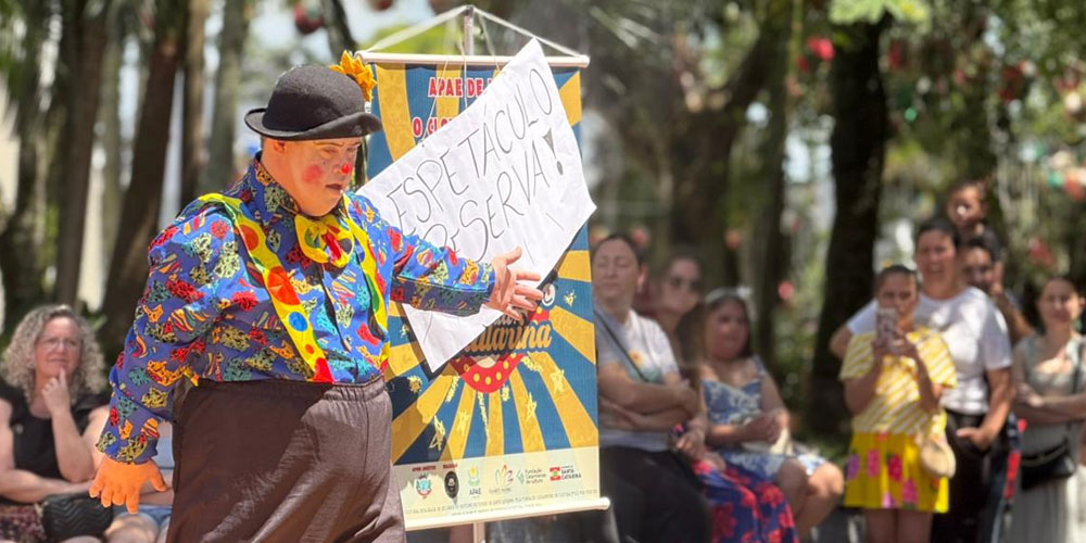 A união da arte com a força da inclusão despertou reflexões – e potentes risadas – na Praça da Matriz São Donato na manhã deste sábado, dia 6. Com plateia cheia, o Espetáculo da Bailarina estreou em clima de celebração após seis meses de preparação. A apresentação foi realizada pelo Grupo O Clown e o Down, vinculado à Apae de Içara, com fomento do Prêmio Elisabete Anderle de Estímulo à Cultura – Edição 2024, do Governo do Estado de Santa Catarina, por meio da Fundação Catarinense de Cultura, e apoio logístico do Governo Municipal.