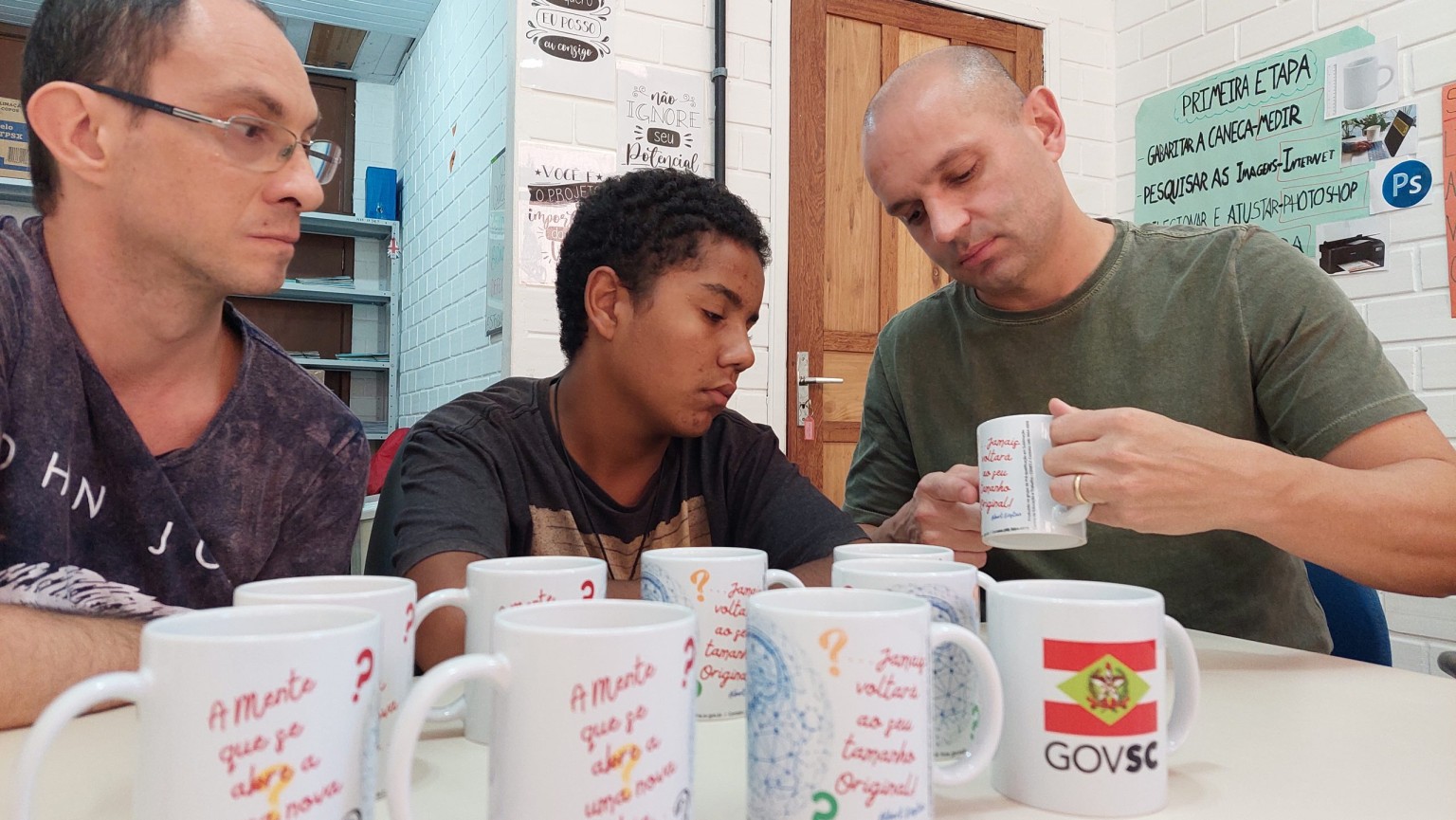 No espaço, juntamente com outros colegas de turma, ele aprende técnicas para impressões em canecas, sendo destacado o desenvolvimento de habilidades e competências compatíveis com as exigências do mundo do trabalho