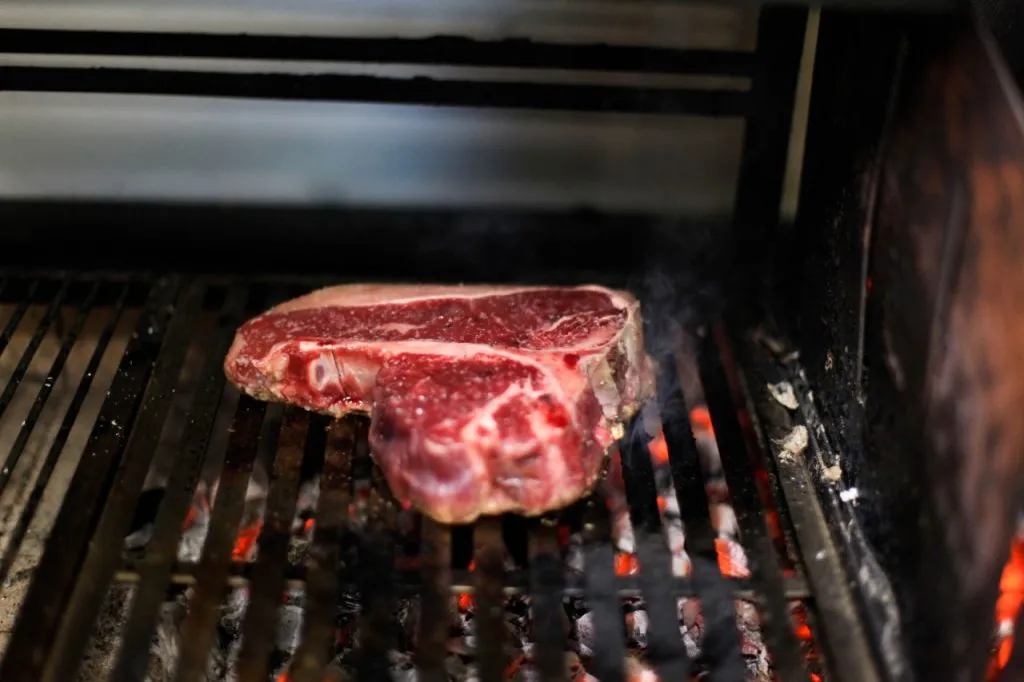 Entro com o t-bone na grelha, com brasa forte e douro um lado. Após cerca de cinco minutos, viro a peça e douro também o outro lado. Com o pegador, seguro a gordura da carne para baixo para que ela caramelize e derreta. Subo a carne ao segundo andar para acertar o ponto e então, entro com os legumes na grelha.
