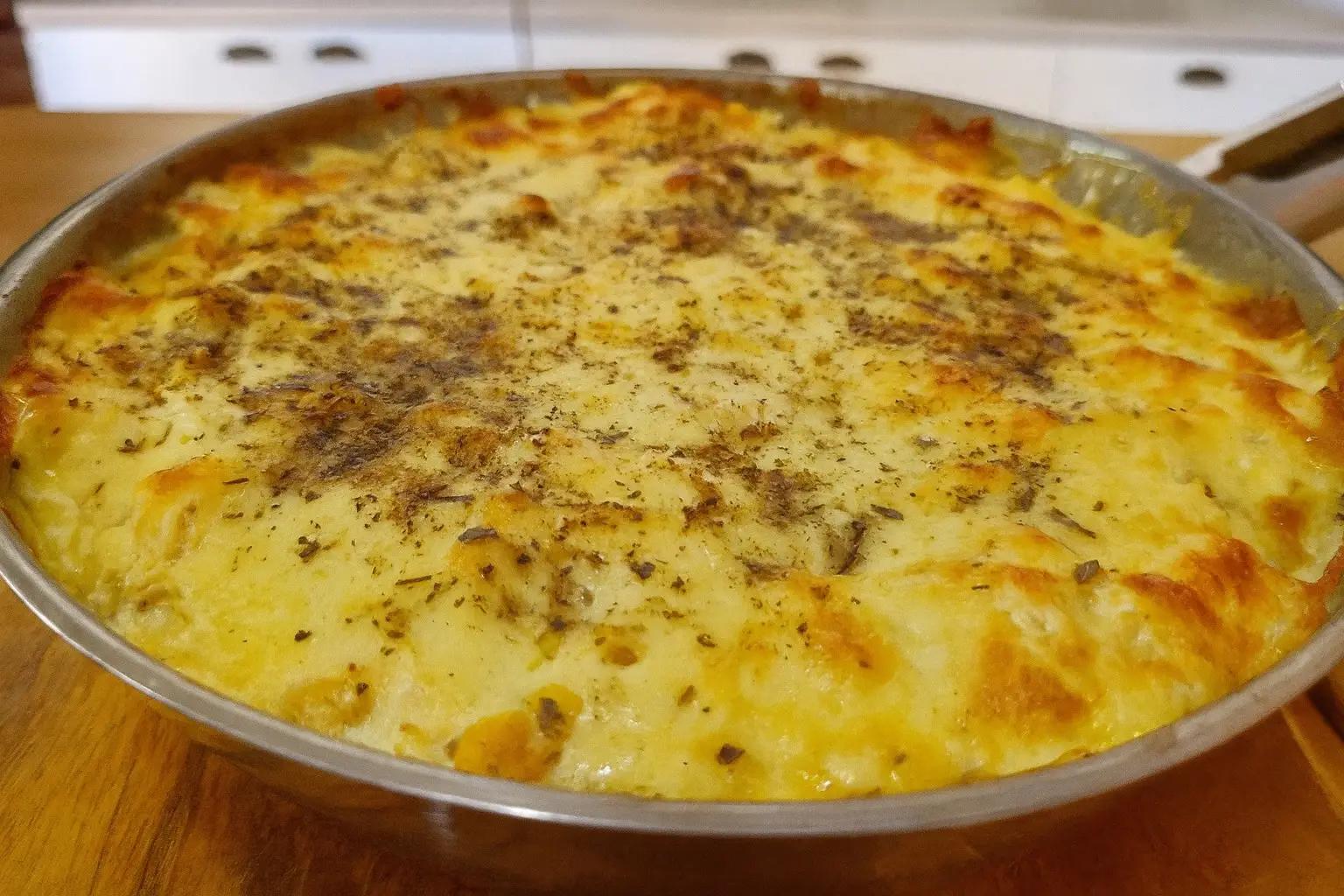 Retire do forno e só então adicione a batata palha por cima, garantindo crocância.