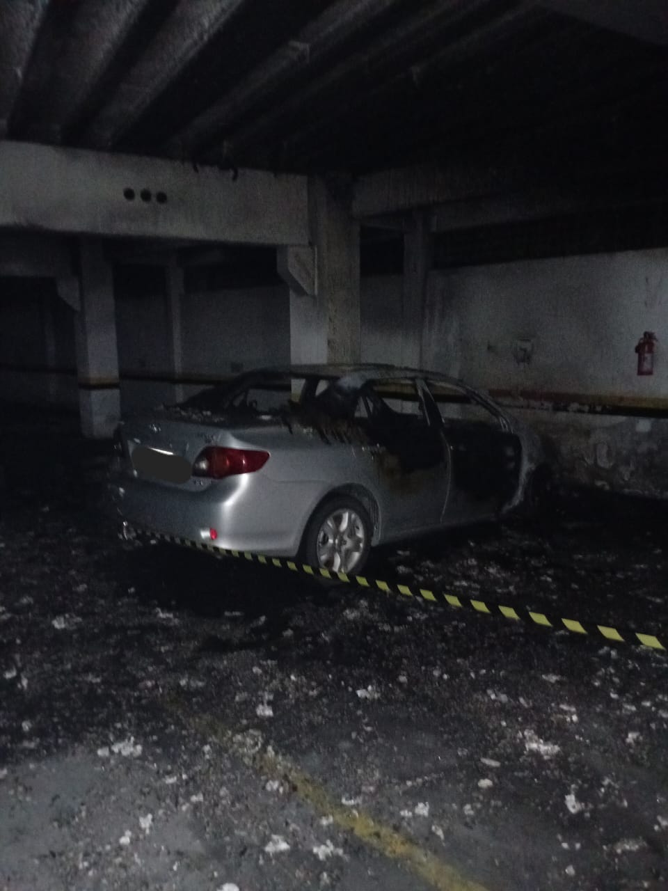 De acordo com o Corpo de Bombeiros, a guarnição foi acionada por volta das 18h28 e, ao chegar ao local, confirmou a ocorrência. As chamas atingiram um veículo Toyota Corolla que estava na garagem do prédio.