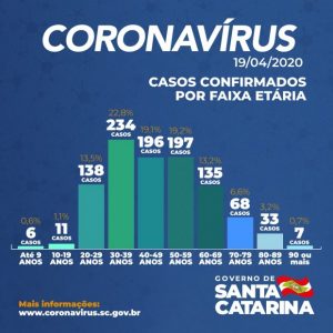 O Governo de Santa Catarina informou que há registro de 1.025 casos confirmados de infecção pelo novo coronavírus. O dado foi divulgado pelo governador Carlos Moisés no domingo, dia 19. A Covid-19 já causou 35 mortes no estado desde o início da pandemia. Os óbitos mais recentes são de três homens, residentes em Braço do Norte (37 anos), Camboriú (68) e Tangará (56). Todos faziam parte de grupo de risco.