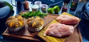 Na receita de hoje, faremos um hambúrguer de peito de frango grelhado e usaremos os conceitos tex-mex em nossos molhos. Uniremos o sour cream (creme azedo) dos estados unidos ao guacamole mexicano.