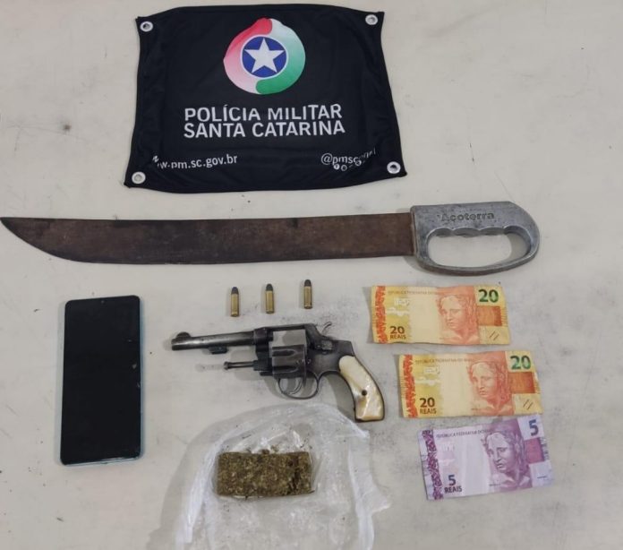 Durante a revista pessoal, os policiais encontraram na cintura do homem um revólver calibre 32, contendo três munições intactas no tambor. Em um dos bolsos da calça, foi localizado um invólucro plástico com um torrão de maconha, pesando aproximadamente 26,5 gramas. Ainda conforme a PM, preso à motocicleta havia um facão com lâmina de 47 centímetros.