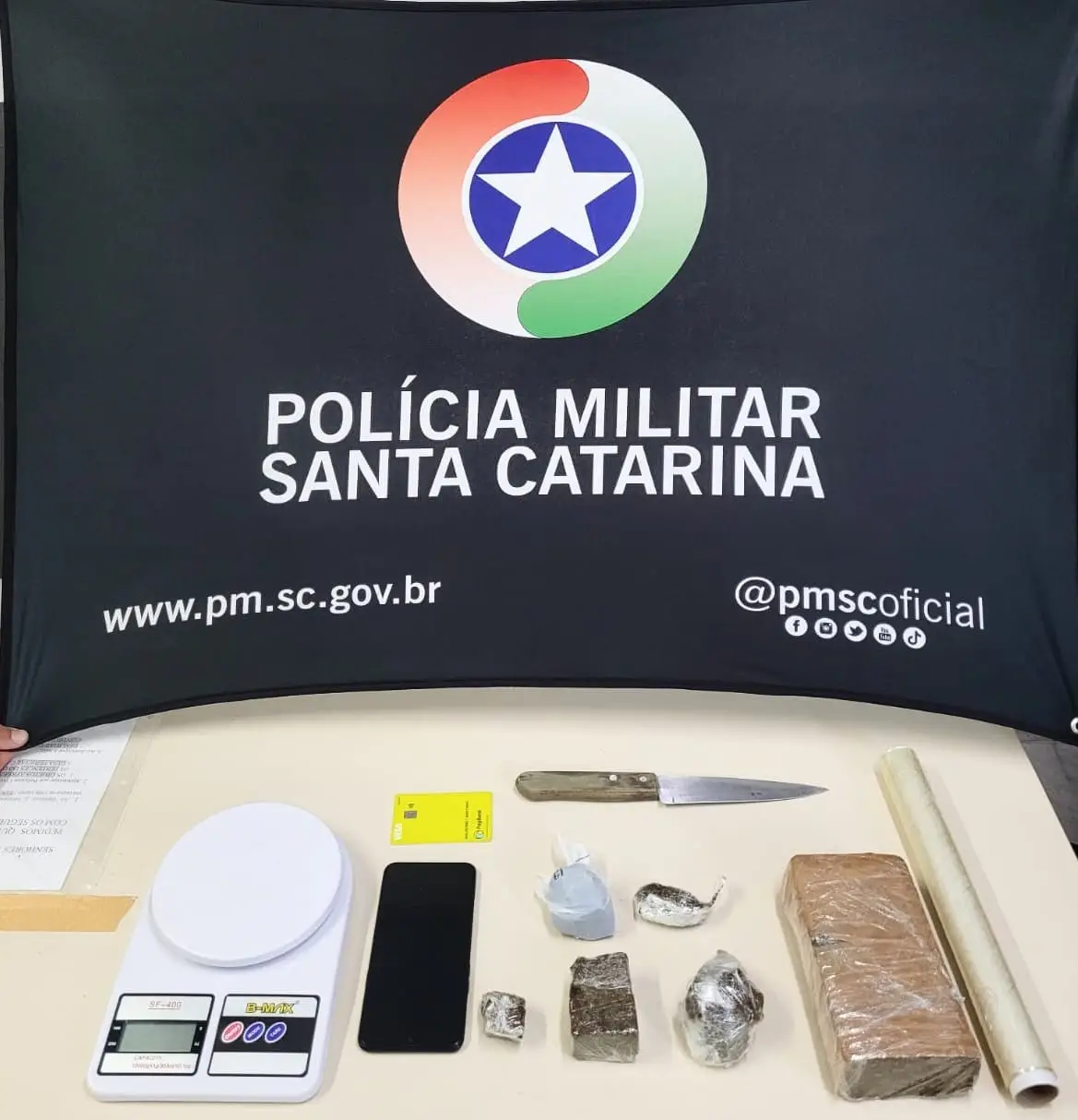 Em sua residência foram encontrados cerca de meio quilo de substância semelhante à maconha, balança de precisão e apetrechos comuns na traficância.