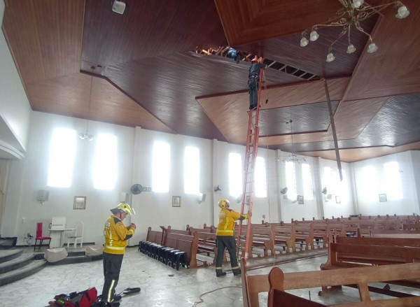 No local, a guarnição constatou que um homem adulto realizava a instalação de cabos elétricos no telhado da igreja, a cerca de 10 metros de altura, sem o uso de qualquer equipamento de ancoragem ou segurança. Durante o serviço, houve o rompimento parcial do telhado, fazendo com que a vítima ficasse pendurada no forro da edificação, que também apresentava comprometimento estrutural, gerando risco iminente de queda.
