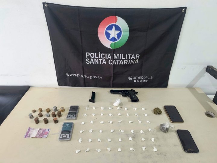 Diante da situação, realizou-se buscas no interior do imóvel e um simulacro de arma de fogo foi encontrado, além de 36 gramas de maconha, uma caixa contendo 54 gramas de cocaína e duas balanças de precisão.