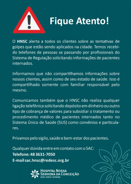 O Hospital Nossa Senhora da Conceição, de Tubarão, emitiu nota nesta quinta-feira (8) alertando sobre tentativas de golpes que estão sendo aplicados na cidade. De acordo com a nota, a instituição tem recebido telefonemas de pessoas se passando por profissionais do Sistema de Regulação, solicitando informações de pacientes internados.