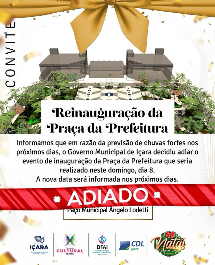 “Devido à previsão de chuva, precisamos adiar a inauguração da Praça da Prefeitura. Em breve, divulgaremos a nova data”, diz comunicado do Governo Municipal.