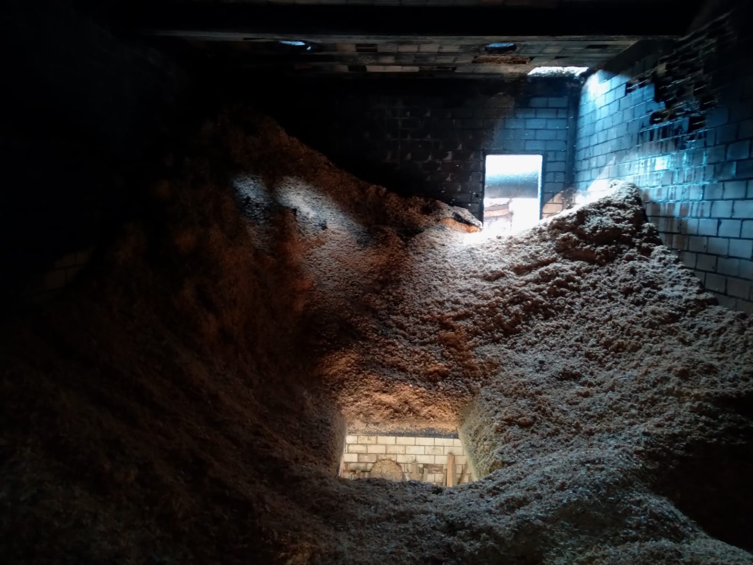 De acordo com os bombeiros, o incêndio atingiu um pavilhão de alvenaria com área aproximada de 450 metros quadrados. As chamas iniciaram e permaneceram concentradas em um silo de alvenaria carregado com cerca de 15 metros cúbicos de serragem, material de fácil combustão.