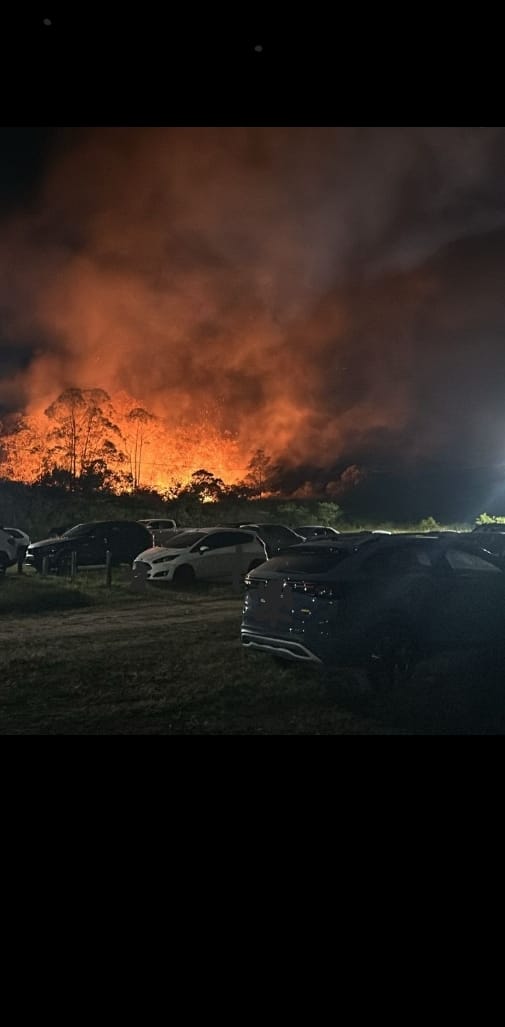 Incêndio em vegetação (eucaliptos) de grandes proporções com dois focos distintos, próximo a um estabelecimento (danceteria), oferecendo risco para o estabelecimento e carros estacionados no local, foi registrado nes madrugada em Balneário Rincão.